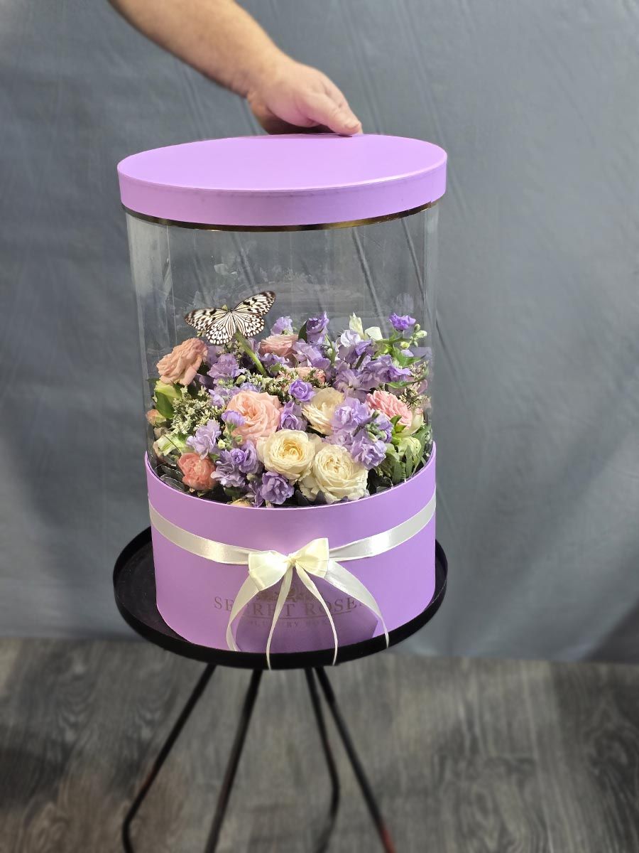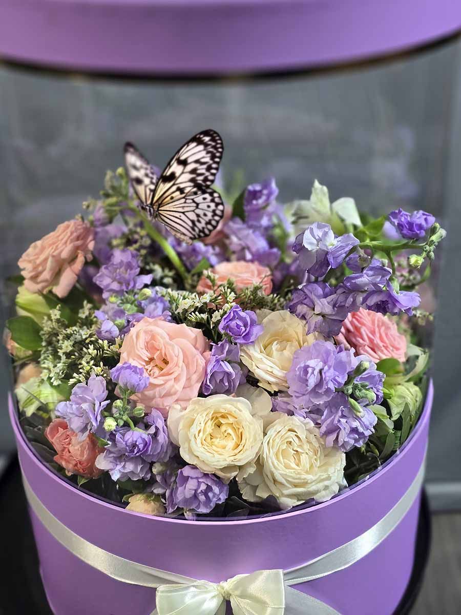 В нежном объятии весны, где каждый лепесток словно шепчет о любви и загадках природы, раскрывается изящество букета, сочетающего в себе красоту живой бабочки и аромат матиолы. Уникальная композиция, упрятанная в прозрачной коробке, словно застывшая в моменте, становится символом восхищения перед великолепием жизни.