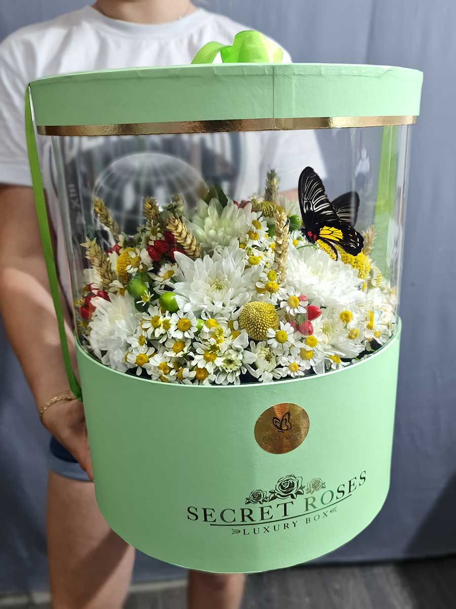, коробка, оазис, лента, огромная бабочка или три не крупные