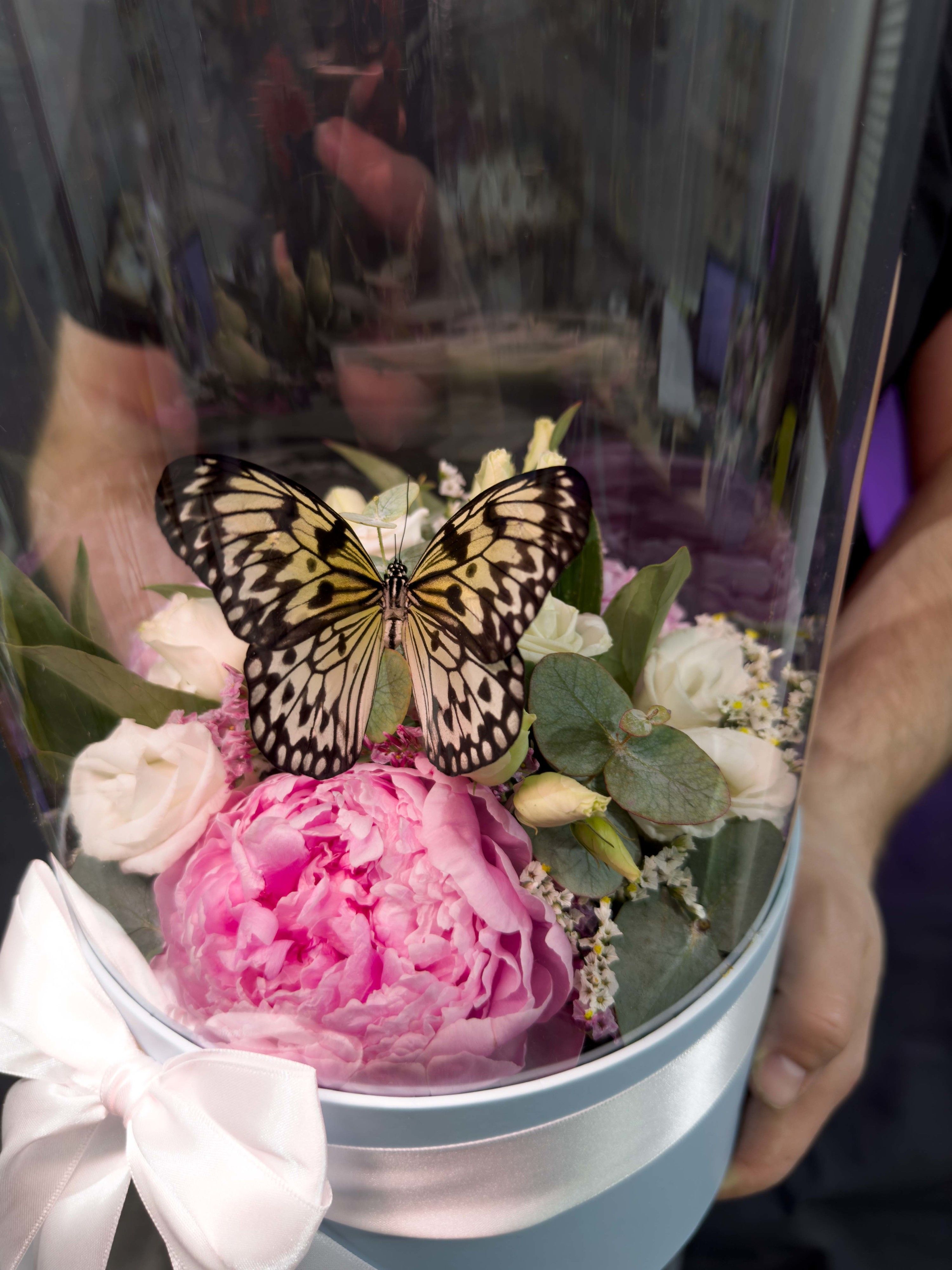 Состав: пионы 3 шт , эустома заполняет пространство между пионами , лиониум белый и розовый, эвкалипт придант ароиат .Одна бабочка большая.