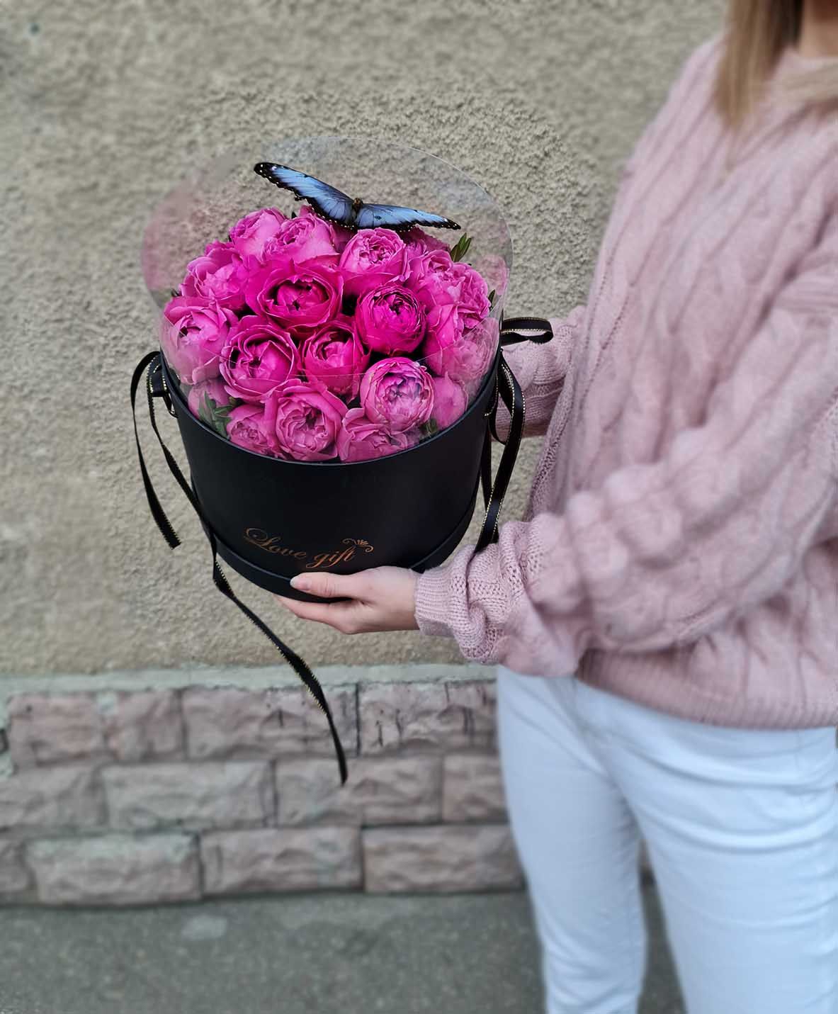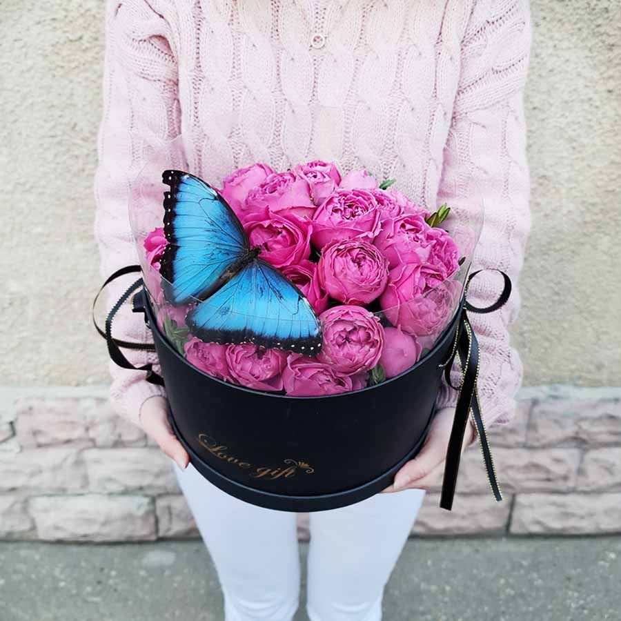 Роза пионовидная мисти бабблз, оазис, огромная живая бабочка или 3 небольших.