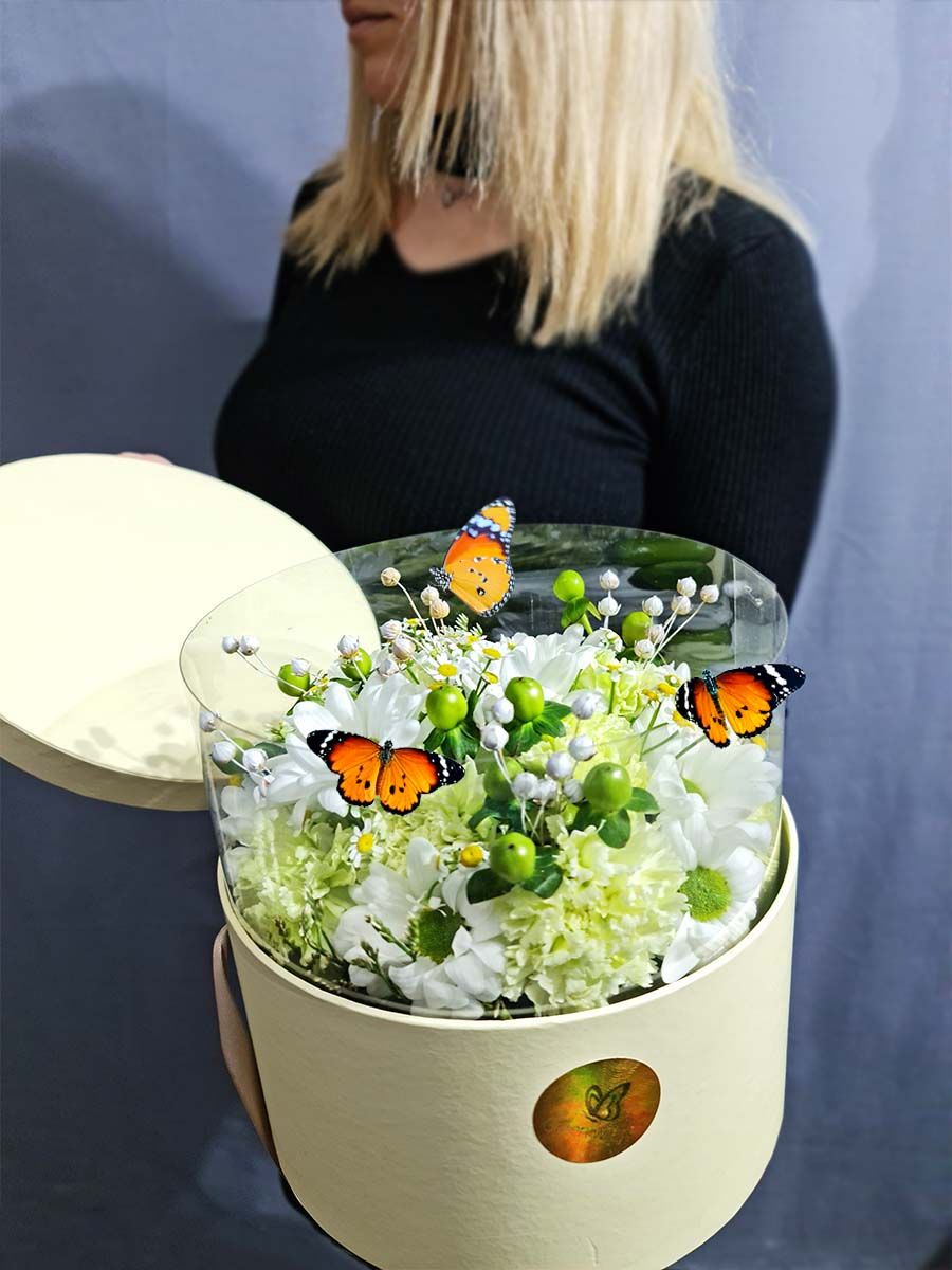 Хризантема похожая на большую ромашку, диантус, гиперикум, рускус, сухоцвет белый три бабочки .