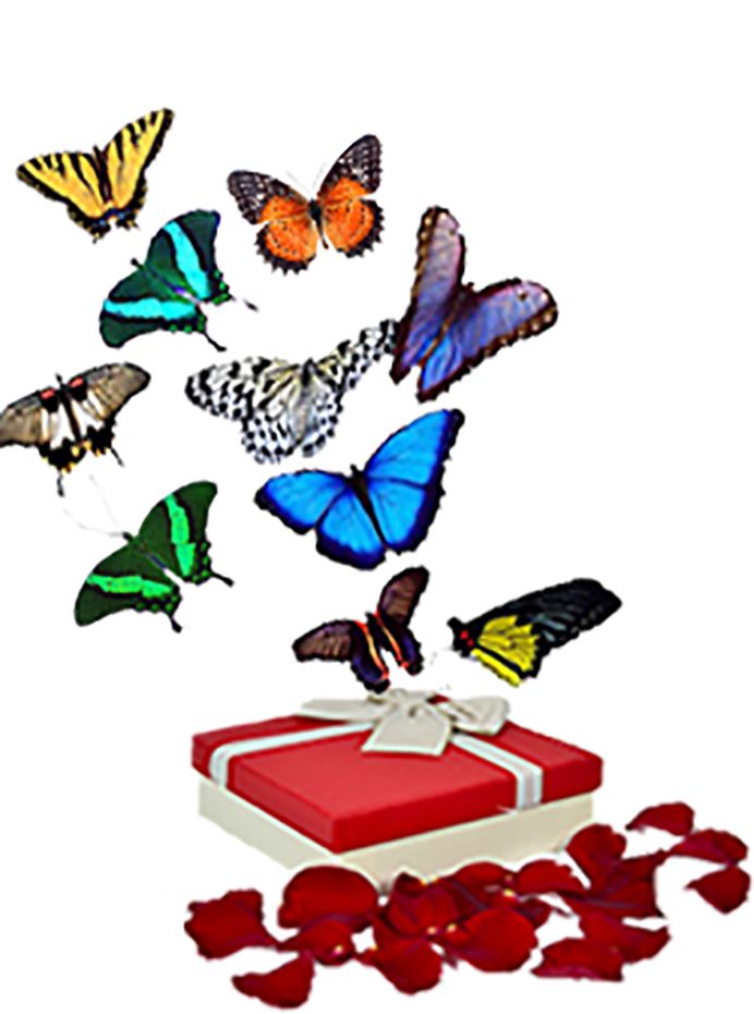 Легкое движение руки — коробка с бабочками открывается, и одиннадцать роскошных экзотических красавиц грациозно устремляются вверх, а затем разлетаются в разные стороны, восхищая и радуя публику! Весь вечер эти чудесные создания будут порхать рядом с вами, создавая ощущение сказки. Такой удивительный праздник надолго останется в памяти!